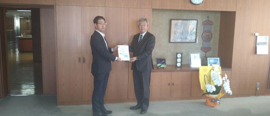 当日はEVIサービスにより、同社とつないで頂いたカルネコ株式会社 代表取締役社長 松元英俊様同席のもと、代表取締役社長 田中豊様が西村町長から購入証明書を受け取りました。