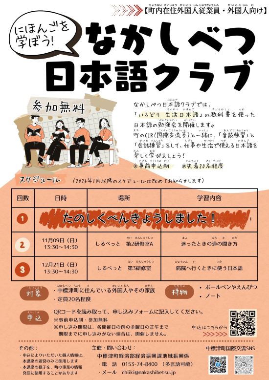 外国人向け日本語学習会「なかしべつ日本語クラブ」生徒募集中(11月・12月開催分)