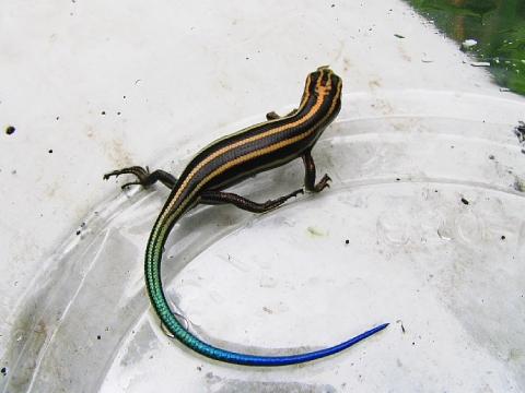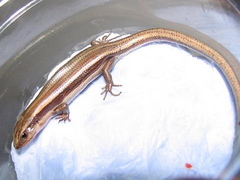 本来「トカゲ」はこの種のことを指します。 幼体の頃は黒地に黄色い線、そして鮮やかな青色のシッポですが、脱皮とともに色が薄れ、成体になると地味な色合いになります。