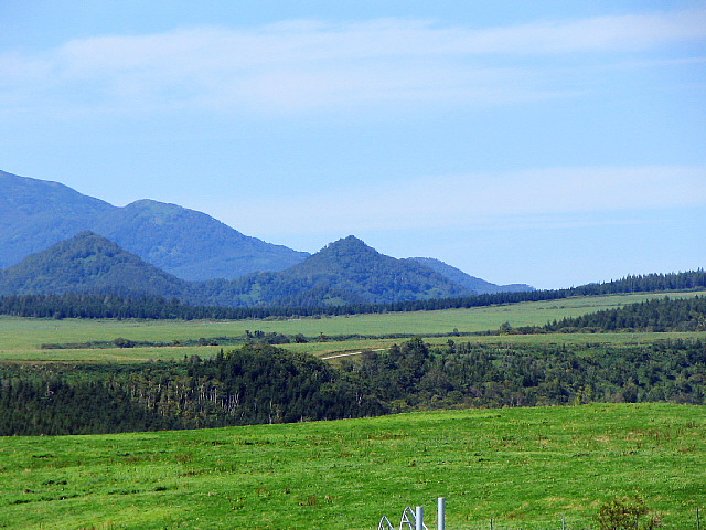 ※28線を車で山の方に向かうと小さな三角の山が2つ見える。左側は無名山、右側(正面)が上股落。