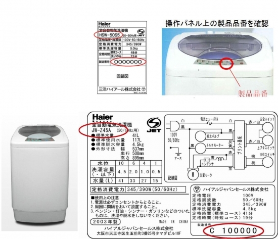 三洋ハイアール株式会社(現ハイアールジャパンセールス株式会社)が輸入した電気洗濯機を使用中、当該製品及び周辺を焼損する火災が発生しました。当該事故の原因は、現在、調査中ですが、モーター用コンデンサの製造工程において、異物が混入していたため、使用中に徐々に絶縁劣化を起こし、内部短絡を起こして出火に至ったものと考えられることから、事故の再発防止を図るため、対象製品について無償点検及び部品交換(コンデンサの交換)を呼び掛けています。三洋ハイアール株式会社(2007年3月解散)が輸入した電気洗濯機も含まれます。対象製品をご使用の方はフリーダイヤル 0120-865-123 までご連絡いただきますようお願いいたします。
