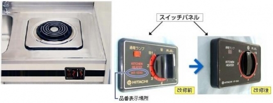 当該製品について、身体や物が接触し、意図せずスイッチが「入」となる可能性がある構造になっており、電気こんろの上や周囲に可燃物が置かれていた場合に、火災に至ることがあるため、対象製品について、新聞社告への掲載や新聞折り込みチラシで呼び掛け、スイッチパネルのつまみへのカバーの取付け改修を無償で実施しています。対象製品をご使用の方は日立アプライアンス株式会社 フリーダイヤル 0120-256-557 または小形キッチンユニット用電気こんろ協議会 フリーダイヤル 0120-355-915 までご連絡いただきますようお願いいたします。