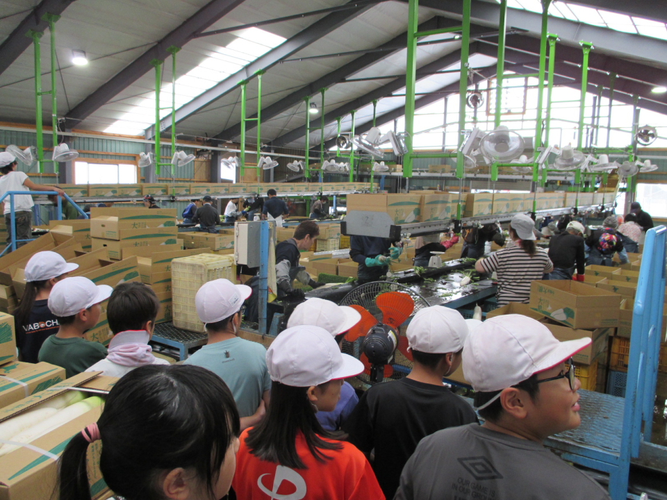 収穫体験では大根を収穫し、その後、中標津町農業協同組合野菜選果場(俵橋)で大根とブロッコリーが箱詰め(商品化)される様子とミニトマトのビニールハウスを見学しました。
