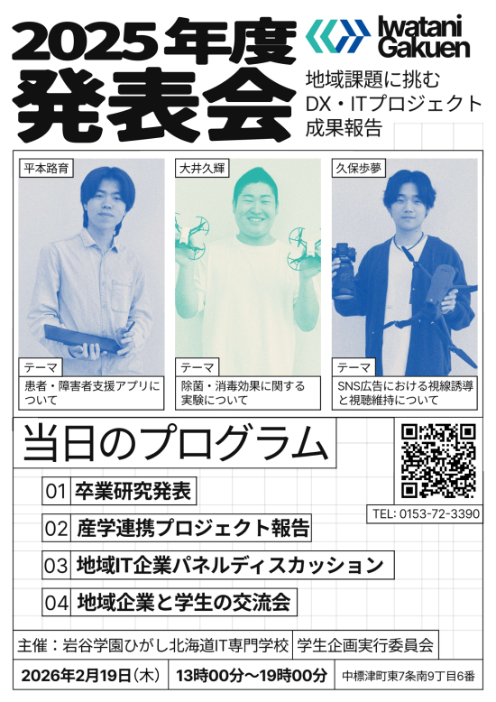 町内に開校し、今年初めて第1期生となる卒業生を輩出する岩谷学園ひがし北海道IT専門学校は、2月19日に卒業研究などの発表会を開催しますが、併せて「地元企業と学生の交流会(マッチング会)」を開催されます。
