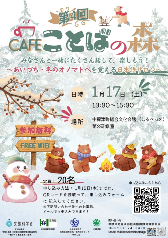 本町の国際交流・多文化共生イベント「CAFEことばの森」。4回目となる今回は、「なかしべつ日本語クラブ」との合同開催です。参加費は無料ですが事前申込が必要ですので、別添チラシのQRコードか地域振興係のメールアドレス・お電話にてお申し込みください。