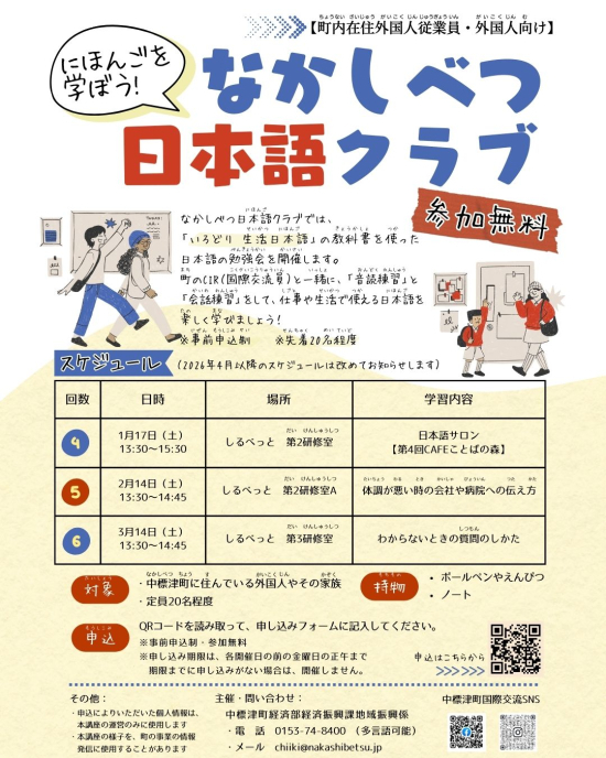 外国人向け日本語学習会「なかしべつ日本語クラブ」参加者募集中!