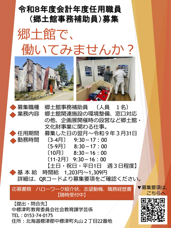 郷土館事務補助員募集のご案内 現在、郷土館では「郷土館事務補助員(会計年度任用職員)」を随時募集を受け付けております。業務内容や応募方法については、サイト内の会計年度任用職員の募集ページよりご確認ください。 会計年度任用職員募集のご案内 令和8年度郷土館管理人募集(広報資料)(形式:3MB) このページの情報に関するお問い合わせ先 教育委員会社会教育課学芸係 電話番号:0153-74-0175FAX:0153-73-5333 ページの先頭へ