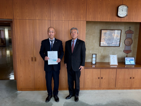 当日は守谷市長 松丸修久様同席のもと、代表取締役 梅木伸治様が西村町長から購入証明書を受け取りました。