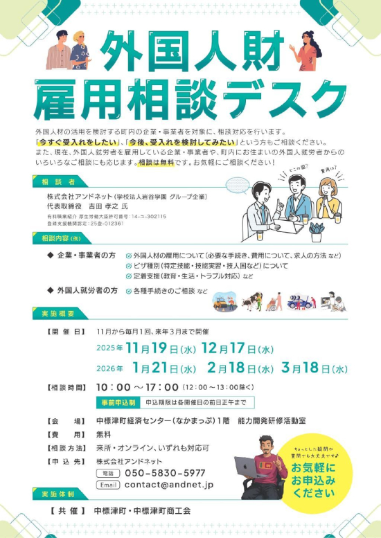 相談は、町内で日本語学校・専門学校を経営する岩谷学園のグループ企業で、外国人材の受入れを扱う「株式会社アンドネット」が対応します。